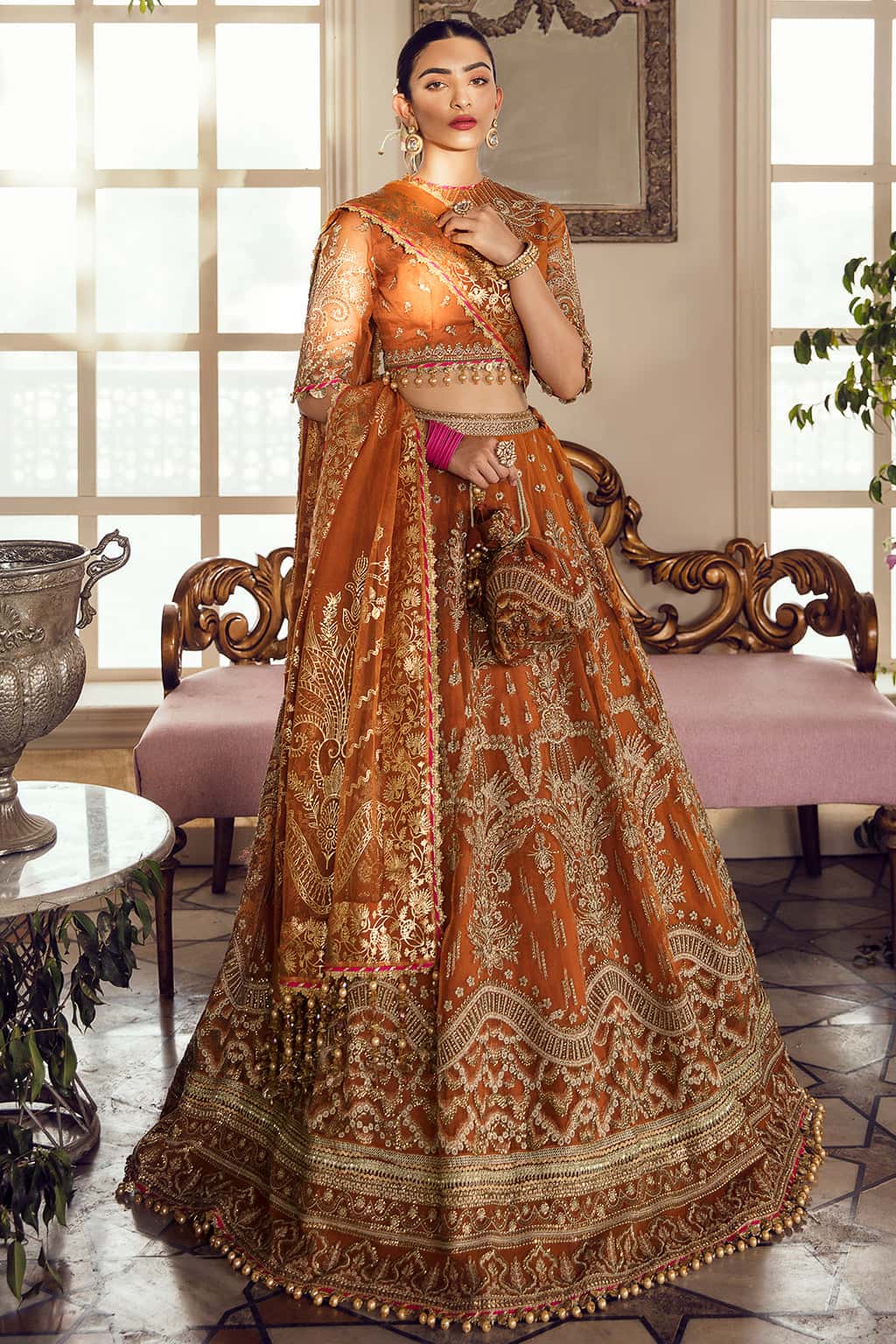 Rendered in a rich Apricot Orange, ‘Oriana’ is a stunning ensemble which has a floral and celestial filigree that is brought together with gold tilla and silk thread work embroidery. Heavy sequins add luster and shimmer and a foil printed dupatta of the same hue makes this the perfect mehndi outfit.