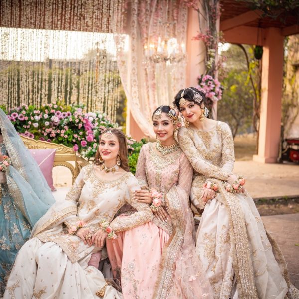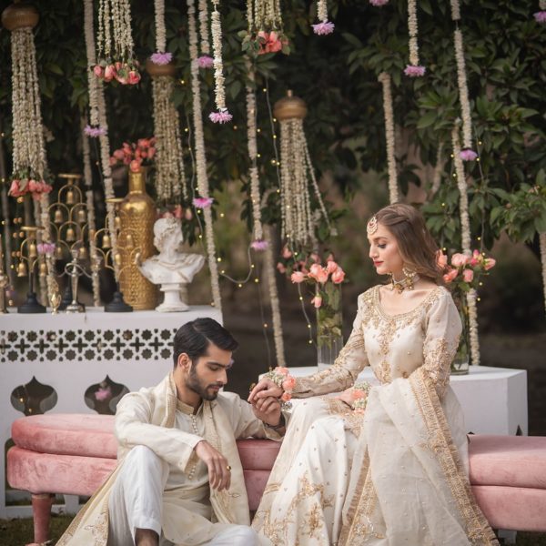 “Zohra: Embodied Elegance in Ivory and Gold. An ethereal ensemble featuring an organza shirt and dupatta paired with raw silk farshi gharara. Exquisitely hand-embellished to radiate timeless beauty.”